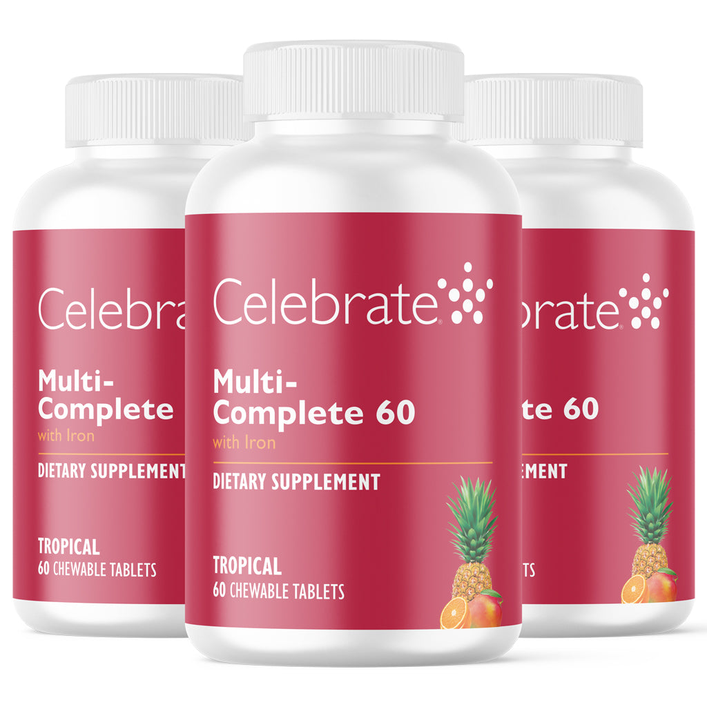 Celebrate Multi-Complete 60 satur visus vitamīnus un minerālvielas, kas ir sadalītas pa divām devām dienā, pacientiem tikai jāpievieno kalcijs. Šim multivitamīnam ir visaugstākais dzelzs saturs no visiem tirgū pieejamajiem bariatriskajiem multivitamīniem, tāpēc tas ir lieliski piemērots pacientiem, kuriem ir veikta viena anastomozes procedūra un kuriem nepieciešams vairāk dzelzs. Šis bariatriskais multivitamīns atbilst ASMBS standartiem attiecībā uz multivitamīnu un dzelzs saturu pēc bariatriskās operācijas, kā arī satur lielāku B-12 vitamīna daudzumu (1000 mcg). Šī integrētā formula nodrošina maksimālu biopieejamību, jo mēs rūpīgi atlasījām katru vitamīna un minerālvielas formu, lai uzlabotu mijiedarbību un uzsūkšanos. MC-60 ir pieejams košļājamā veidā (Tropu garša) vai kapsulās.